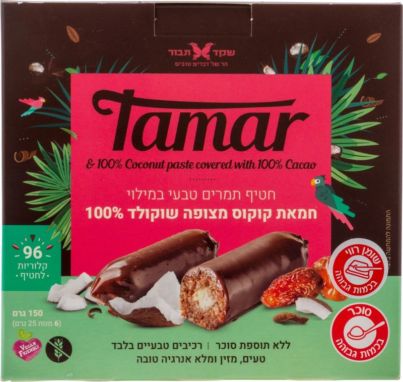 מארז חטיפי תמר במילוי חמאת קוקוס בציפוי שוקולד 100% קקאו שקד תבור