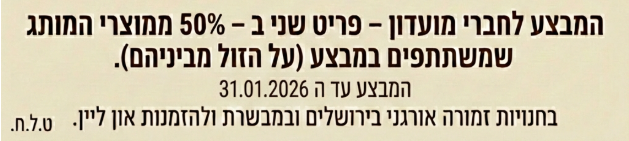 5% הנחה על מגוון המוצרים ללא גלוטן ( בלי כפל מבצעים במקרים בהם מוצר ללא גלוטן במבצע אחר ).