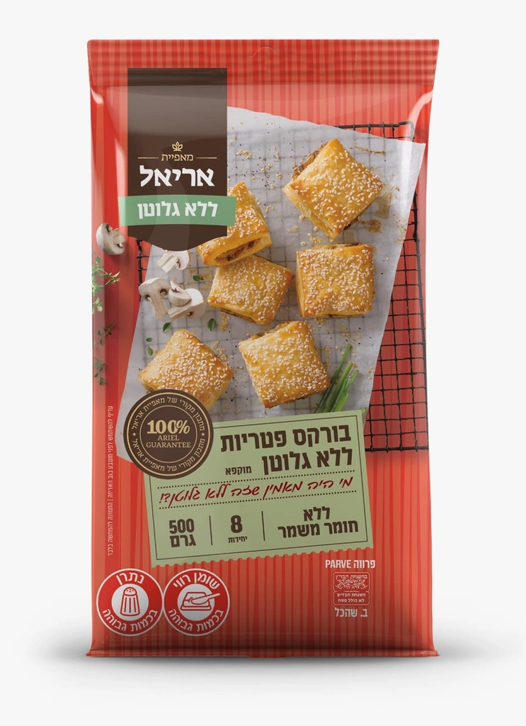 בורקס מוקפא מבצק עלים ללא גלוטן, ממולא במלית פטריות (כ-12% פטריות) מתובלת. המוצר מגיע מוכן לאפייה מהירה בתנור ומיועד לאנשים הנמנעים מגלוטן (צליאק) ולשמירה על כשרות פרווה.
