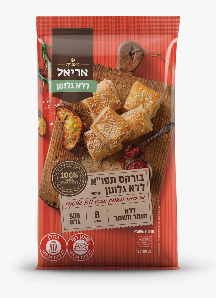 בורקס מוקפא מבצק עלים ללא גלוטן, ממולא במלית תפוחי אדמה מתובלת. המוצר מגיע מוכן לאפייה מהירה בתנור ומיועד לאנשים הנמנעים מגלוטן (צליאק) ולשומרי כשרות פרווה.