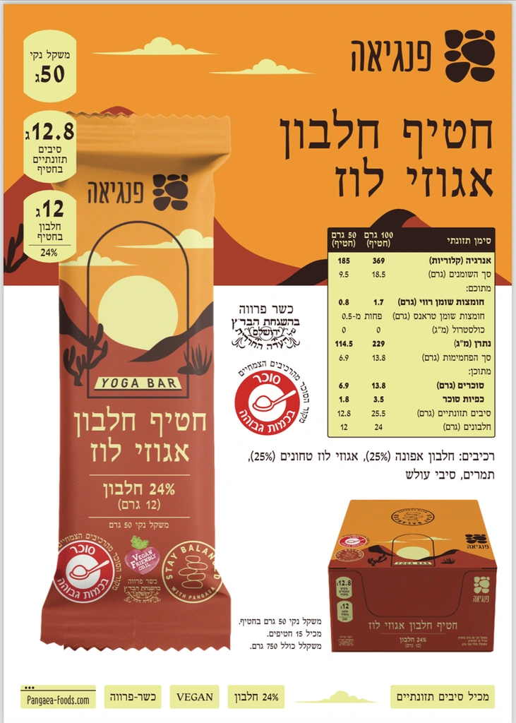 חטיף חלבון יוגה בר בטעם אגוזי לוז של המותג פנגיאה הוא חטיף אנרגיה עשיר בחלבון, המשלב טעם עשיר של אגוזי לוז. הוא מיועד לספק מנת חלבון איכותית ומהירה, ומשמש כנשנוש מזין.