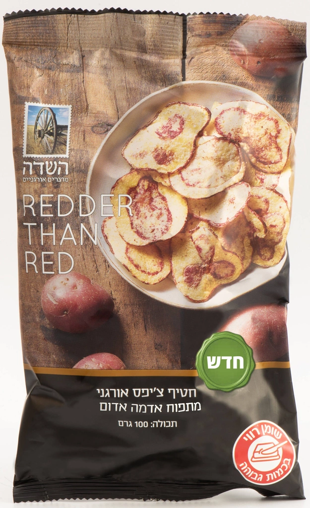 חטיף צ'יפס אורגני מתפוח אדמה אדום של המותג השדה הוא צ'יפס מיוחד במינו, העשוי מתפוחי אדמה אדומים אורגניים. הוא מטוגן בשמן דקלים ומשלב טעם עשיר עם צבע אדמדם-ורדרד ייחודי.