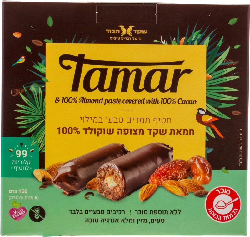 מארז חטיפי תמר במילוי חמאת שקדים בציפוי שוקולד של שקד תבור הוא חטיף אנרגיה המשלב את המתיקות הטבעית של תמר מג'הול במילוי חמאת שקדים, בציפוי שוקולד מריר. החטיפים מהווים נשנוש מתוק, עשיר ומזין.