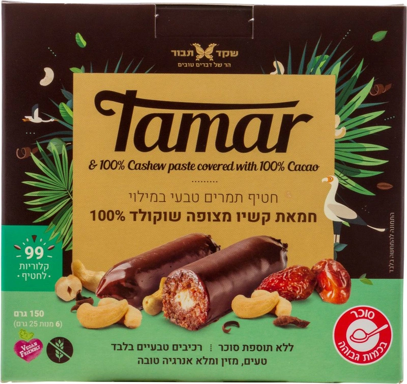 מארז חטיפי תמר מצופה שוקולד 100% קקאו של שקד תבור הוא חטיף אנרגיה המשלב את המתיקות הטבעית של תמר מג'הול איכותי עם ציפוי שוקולד מריר ללא תוספת סוכר. החטיפים מהווים נשנוש מאוזן בין מתיקות טבעית למרירות עשירה.