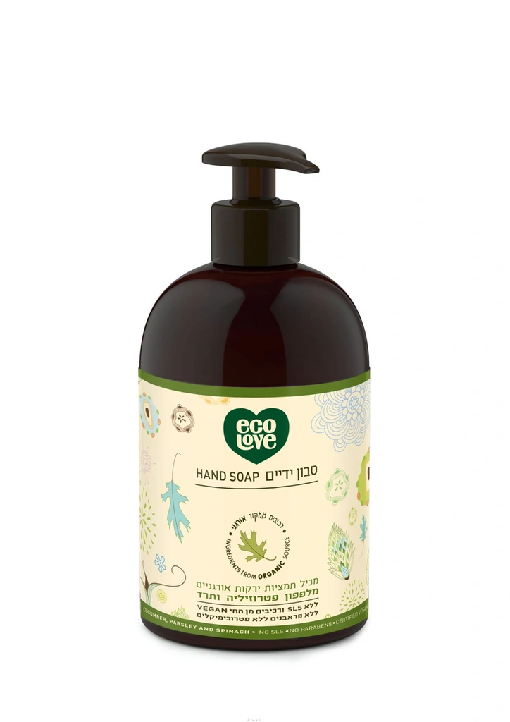סבון ידיים טבעי מתמציות אורגניות: מלפפון, פטרוזיליה ותרד. לכל המשפחה מגיל חצי שנה. הקולקציה הירוקה עשירה בויטמין C וויטמינים מקבוצת B הידועים כאנטיאוקסידנטיים . ללא SLS, ללא פראבנים ללא רכיבים פטרוכימיקלים. ללא רכיבים מן החי ולא נוסה על בע"ח – מאושר vegan friendly. מיוצר בישראל בסטנדרטים בינלאומיים. והבקבוק – למיחזורית. תכולה: 500 מ"ל.
