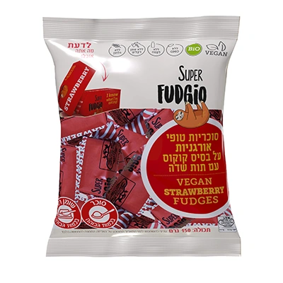 סוכריות טופי אורגניות על בסיס קוקוס עם תות שדה 150 ג' סופר פוג'יו