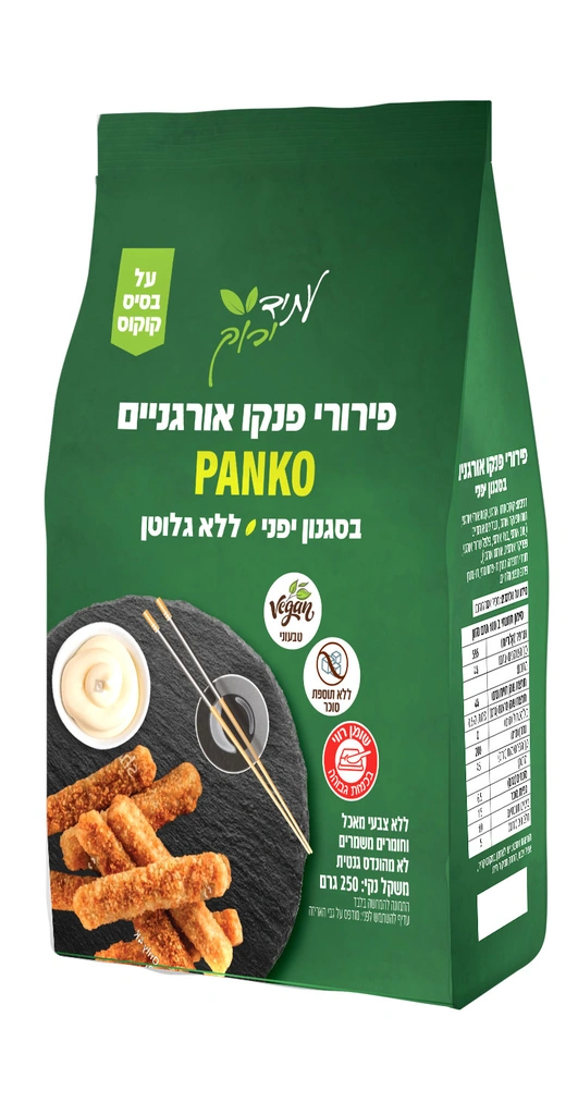 פירורי פנקו פריכים במיוחד, המיוצרים בסגנון יפני אך מותאמים לנמנעים מגלוטן, על בסיס קוקוס טחון אורגני וקמחים אורגניים ללא גלוטן. הפירורים מעניקים ציפוי קראנצ'י, אוורירי ואחיד, והם אידיאליים לטיגון או אפייה של שניצלים, דגים, ירקות או כדורי גבינה. הפנקו הזה הוא חלופה טבעונית ואורגנית לפירורי הלחם המסורתיים.