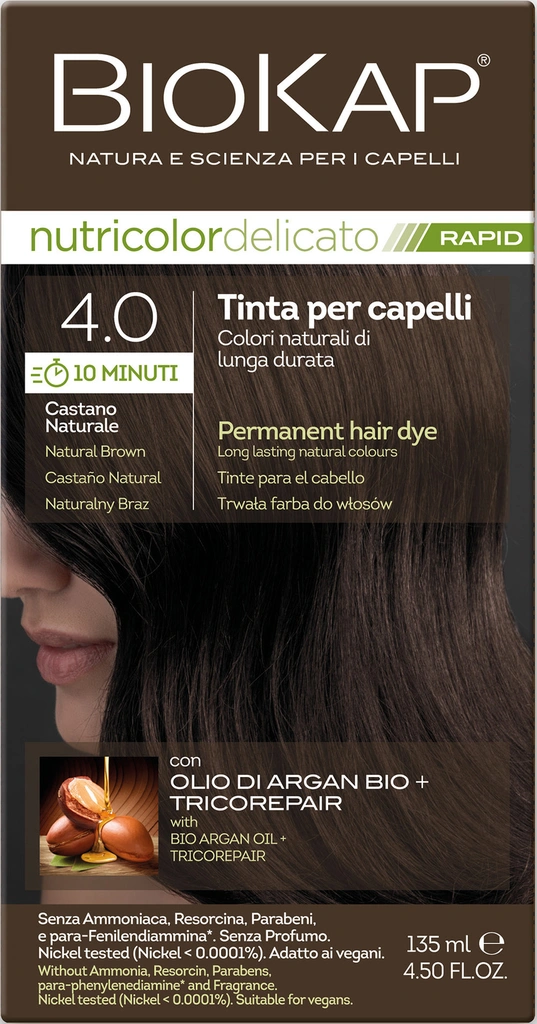 צבע שיער 4.00 חום עדין מסדרת נוטריקולור דליקטו (Nutricolor Delicato) של המותג ביוקאפ (BioKap) הוא צבע שיער המשלב מרכיבים טבעיים עם יעילות צביעה גבוהה, והוא מתאים במיוחד לאנשים עם עור וקרקפת רגישים.