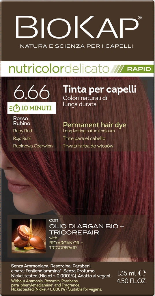 צבע שיער 6.66 מהיר אדום אודם מסדרת ביוקאפ דליקטו (BioKap Delicato) הוא צבע שיער המשלב יעילות ומהירות עם רכיבים טבעיים. הצבע מיועד במיוחד לאנשים עם עור וקרקפת רגישים, ומספק כיסוי מלא של שיער לבן תוך 10 דקות בלבד.