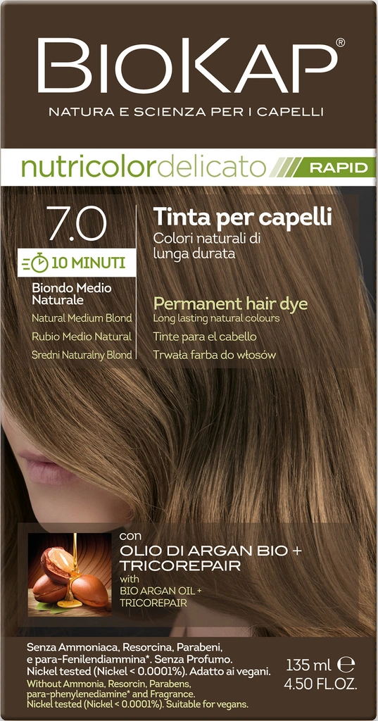 צבע שיער 7.0 מהיר בלונדיני טבעי מסדרת ביוקאפ דליקטו (BioKap Delicato) הוא פתרון חדשני המשלב יעילות ומהירות עם רכיבים טבעיים. הצבע מיועד במיוחד לאנשים עם עור וקרקפת רגישים, ומספק כיסוי מלא של שיער לבן תוך 10 דקות בלבד.