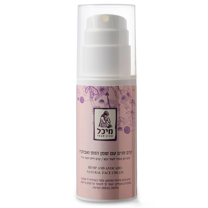 קרם פנים טבעי של מיכל סבון טבעי לעור יבש מכיל שמן המפ ואבוקדו, ומיועד להעניק לעור לחות והזנה ממושכת.
