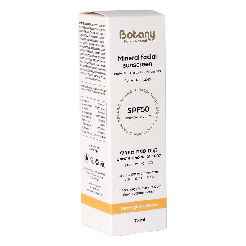 קרם הגנה לפנים של המותג בוטאני (Botany) הוא מוצר טבעי, מינרלי וידידותי לסביבה, שנועד להגן על העור מפני קרינת השמש החזקה. הוא מציע מקדם הגנה גבוה של SPF50, המתאים במיוחד לאקלים הישראלי, והוא מיועד לכל סוגי העור, כולל עור רגיש ועדין.