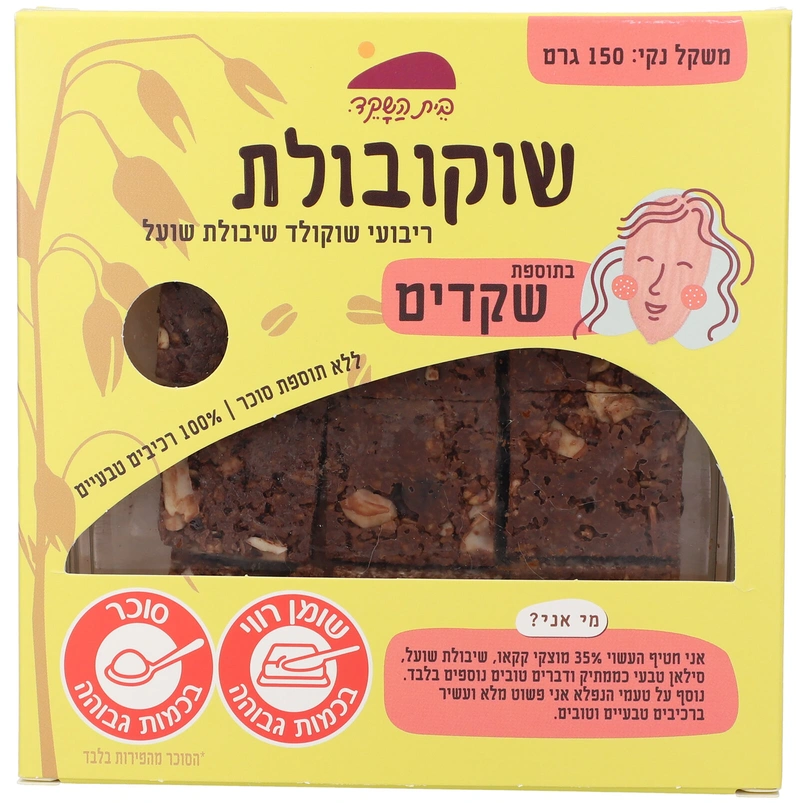 שוקובולת ריבועי שוקולד שיבולת שועל שקדים של המותג בית השקד הם חטיף מרובע המשלב שיבולת שועל ושקדים, מצופה בשוקולד עשיר. הם מהווים נשנוש מתוק ומשביע, מושלם לצד קפה או תה.