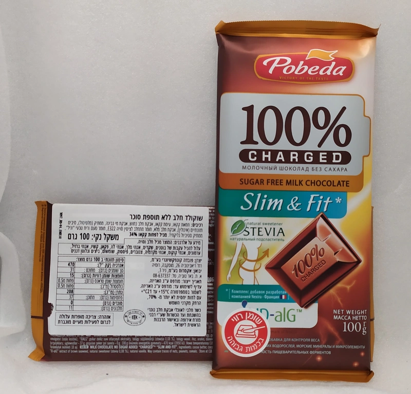 שוקולד חלב ללא סוכר עם סטיביה של המותג צ'ארג'ד (Charged) הוא שוקולד חלב המיועד לצרכנים המעוניינים להימנע מסוכר. במקום סוכר רגיל, הוא מומתק באמצעות סטיביה ומלטיטול.