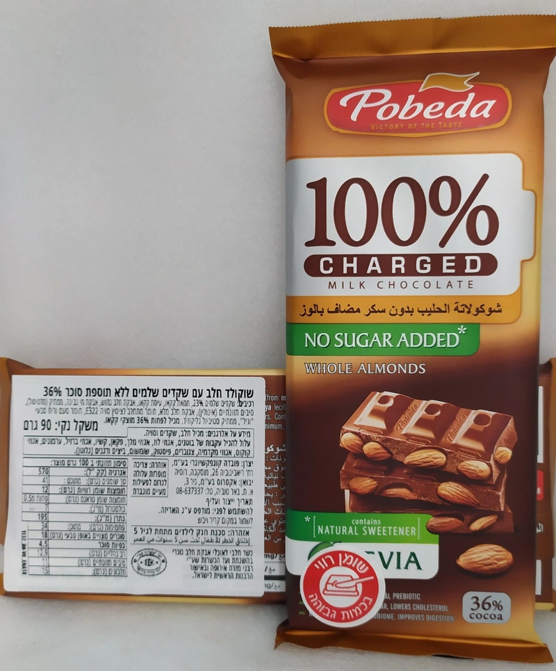 שוקולד חלב עם שקדים של המותג צ'ארג'ד (Charged) הוא שוקולד ללא תוספת סוכר, המשלב את הטעם המתוק והעשיר של שוקולד חלב עם הפריכות של שקדים, תוך שימוש בממתיק סטיביה.