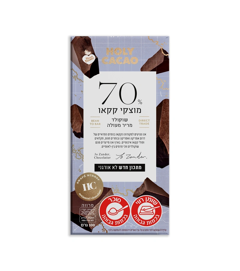 70% קקאו: טבלת השוקולד מכילה ריכוז גבוה של קקאו, שמעניק לה טעם מריר עשיר ומאוזן.