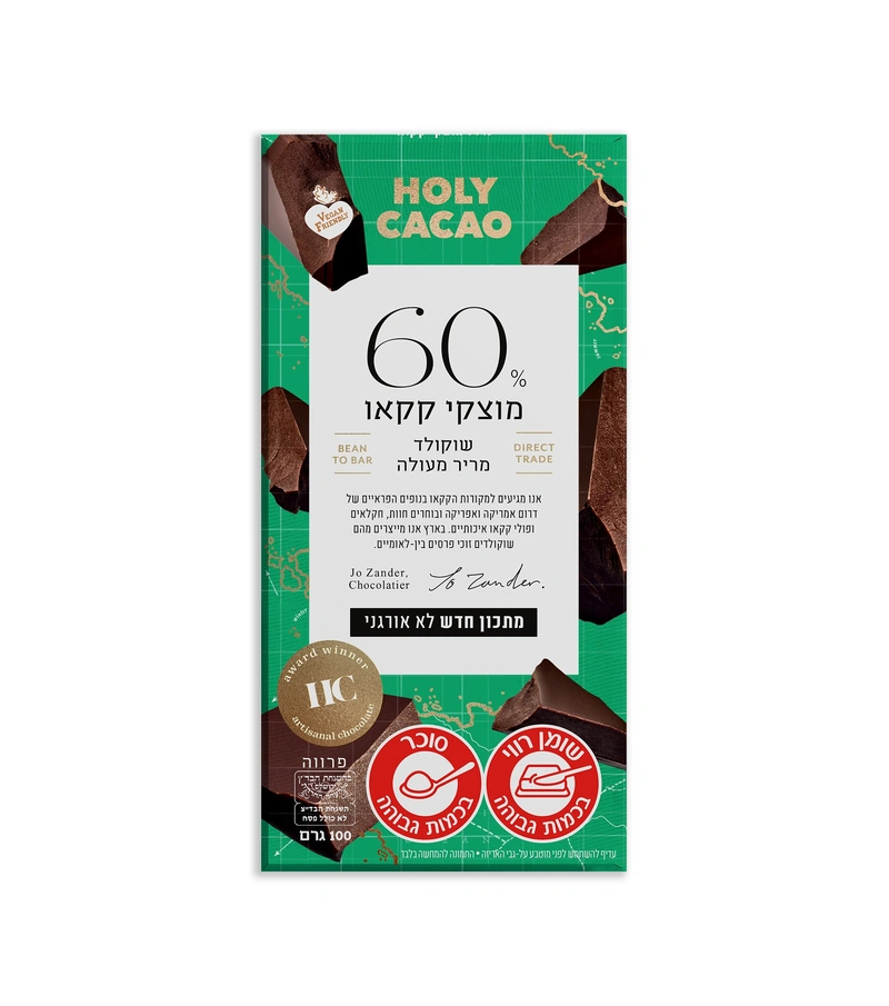 שוקולד 60% של המותג הולי קקאו הוא טבלת שוקולד מריר קלאסי, המאפשרת איזון מושלם בין מרירות למתיקות. לשוקולד טעם עדין, פירותי ומרקם חלק.